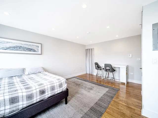 This charming 4th-floor studio is smartly designed for both comfort and function. The light shines in from the three picture windows in the living area. The sleek kitchen with a mix of grey and white cabinetry, is outfitted with premium suite of stainless-steel appliances including a Bosch dishwasher, an Italian-made Bertazzoni range and refrigerator, and a Haier microwave. The beautiful windowed bathroom has been fully and stylishly updated. Throughout the apartment you’ll find shiny hardwood floors and recessed LED lighting.