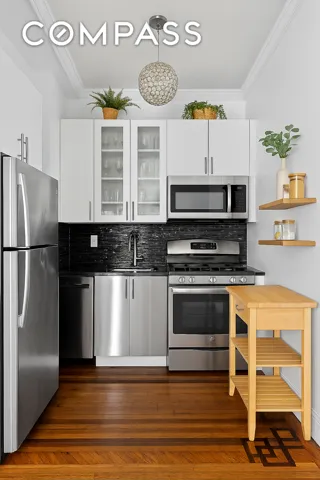 Inside, you’re welcomed by high ceilings, oversized windows, and one of the most striking decorative fireplaces you’ll find in Brooklyn. Original crown moldings, woodwork, and pre-war details remain wonderfully intact, while thoughtful updates bring the space forward — including recessed lighting, a renovated bathroom, and a fully updated kitchen with stainless steel appliances, generous cabinetry, and a gas burning stove.