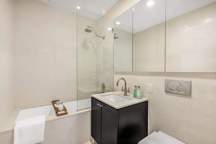 Privately set apart from the entertaining areas are the home’s three bedrooms. The primary suite is a true haven, enjoying dual exposures to the south and west, and offers a large custom walk-through closet that leads into a spa-quality five-piece bath. Outfitted with a Victoria & Albert soaking tub, a frameless glass Grohe rain shower, and a dual-sink vanity. The secondary bedroom includes an en-suite bath with soaking tub and custom storage, while the third bedroom—currently designed as a versatile home office w/ daybed—also features custom closets and easy access to the third full bath. The third bath is styled with Waterworks and Duravit and a glass-enclosed shower.