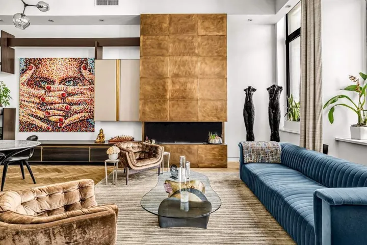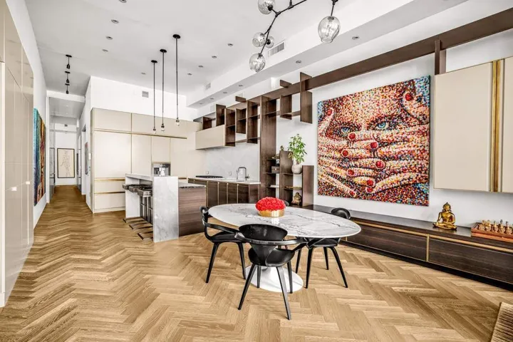 The dramatic 36’ x 22’ great room is anchored by an Eco-Smart fireplace clad in sleek, architectural materials, creating an inviting focal point in the heart of the home. Surrounding the space are oversized north-facing casement windows, which frame views of the Flatiron skyline, architectural landmarks, and tree-lined streets below. The hand-laid 4-inch solid American oak floors in a classic herringbone pattern infuse warmth and sophistication, complemented by custom Italian and Bazzeo cabinetry that blends an enormous amount of concealed storage with artful display. At the center of the open-plan design is a world-class chef’s kitchen, which balances luxury and functionality with precision. A hand-selected marble waterfall island offers counter seating, while custom cabinetry provides ample storage. High-end appliances—Gaggenau oven, 6-burner Viking range, Sub-Zero refrigerator, Miele dishwasher, and Gaggenau built-in coffee system—ensure the kitchen is a working chef’s dream and an entertainer’s showpiece. The adjacent dining area comfortably accommodates 8–10 guests, making it the perfect setting for intimate dinners or lively gatherings.