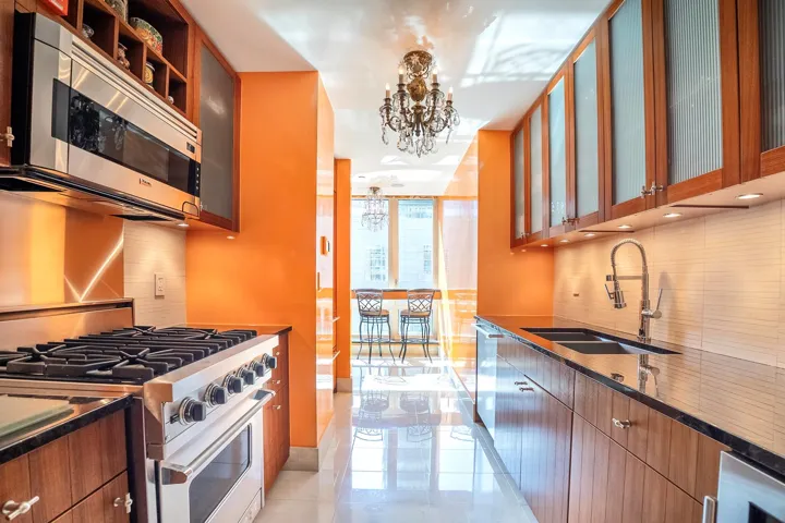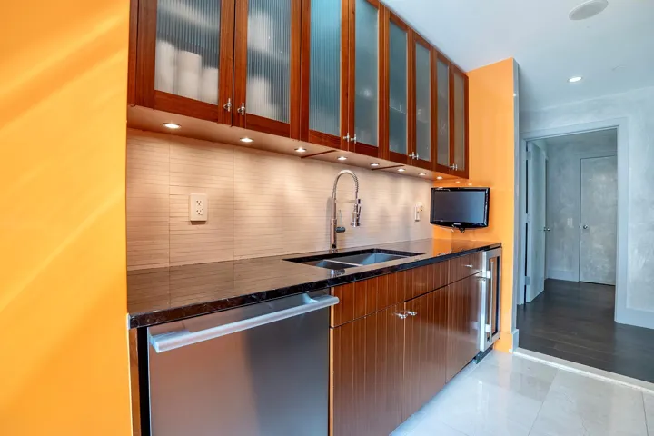 Spanning 1438sf, one enters a proper foyer leading to the dramatic and oversized-corner living room surrounded by floor-to-ceiling windows (UV protected). The windowed chef’s kitchen has a charming dining bar and is replete with appliances by Viking, Subzero, and Bosch, handsome custom walnut cabinetry, granite countertops, wine chiller, and loads of storage, including a generous pantry.