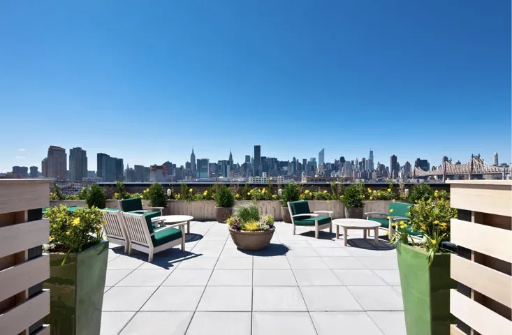 – Landscaped rooftop deck with chaise lounges and outdoor grill overlooking the Manhattan skyline
