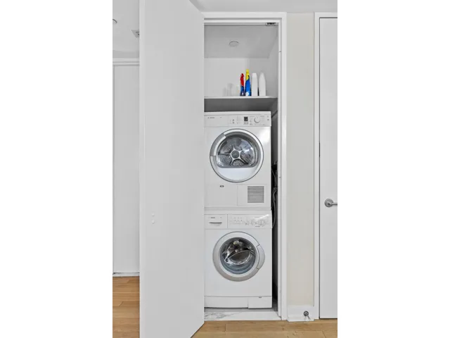 The spa-like bathroom features a high-end vanity with a white Carrera marble countertop, a 8-inch widespread chrome faucet by LACAVA, a medicine cabinet with Italian Artimede lighting, a separate linen closet and a deep-soaking tub by Neptune for a relaxing retreat. Additional conveniences include an in-unit Bosch washer and dryer and a private, deeded 20 SF storage (SU-35).