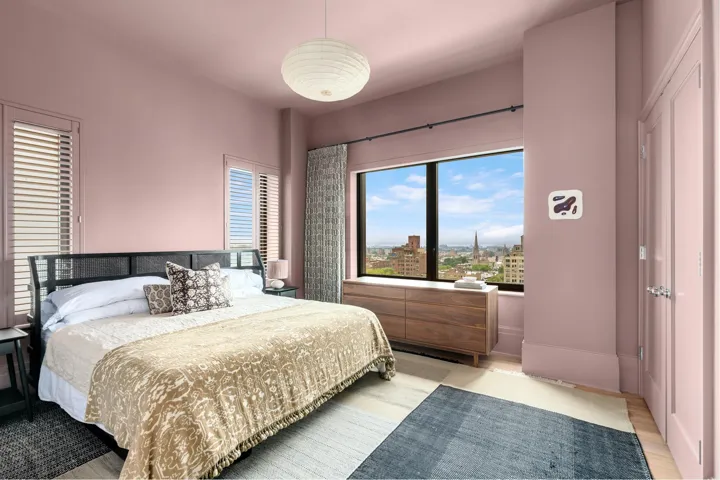 The grand primary bedroom offers extensive custom closet space, detailed wall moldings and is flooded with light from a large picture window bringing in the best sunsets in Brooklyn and even views of the Empire State Building. The ensuite bath features natural Novelda Cream limestone slab walls and flooring and Waterworks fixtures. The Bianco Dolomite marble-tiled shower and private WC are enclosed by pyramid-glass and powder-coated steel doors. A custom vanity with Calacatta Nero carved marble countertops, Duravit sinks, and integrated medicine cabinets with curved corners completes this exceptional spa-like windowed bathroom.