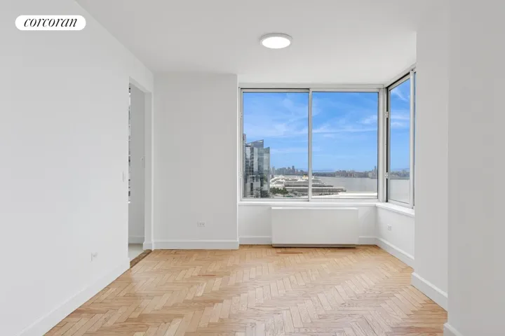 A gracious entry foyer leads to a generously proportioned living and dining room-perfect for both everyday living and elegant entertaining. With 9-foot ceilings, oversized windows, and striking herringbone wood floors, the apartment is bathed in natural light from triple exposures-south, west, and east-providing breathtaking views from every angle.