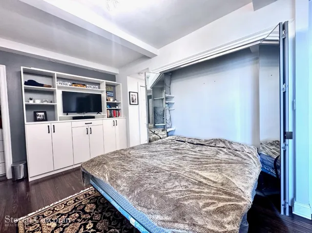 Queen sized Murphy bed with convenient mirrored doors.