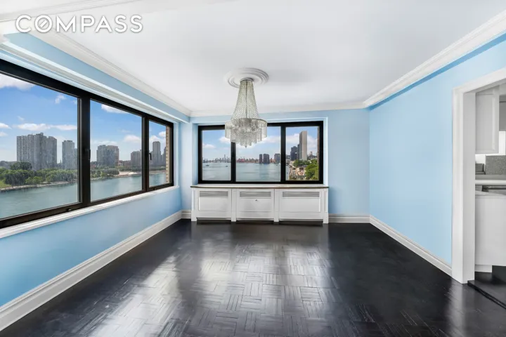 Enter through a gracious square gallery that flows seamlessly into an expansive living room and corner dining room. Oversized windows frame sweeping panoramic views of the East River, 59th Street Bridge, Pepsi Neon Sign, Williamsburg Bridge and the southern skyline, flooding the space with natural light throughout the day.