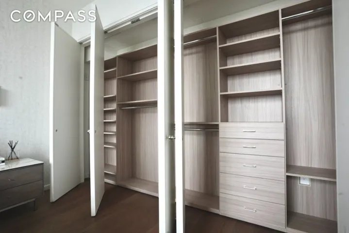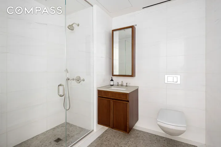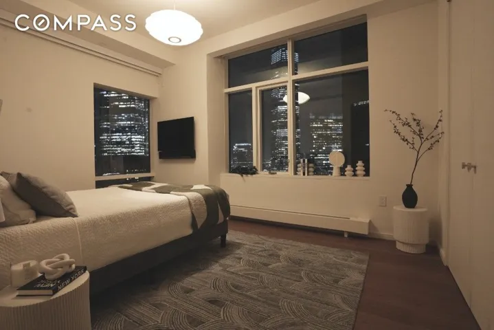 The split second bedroom has stunning New York City views to the south and west featuring the Hudson River and iconic buildings like One World Trade and the Oculus. This versatile space can be set up as a bedroom, den or home office given its comfortable size, extensive built-in closets, and en-suite bathroom with a walk-in shower and heated floors.
