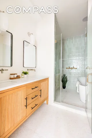 The second floor offers two well-proportioned bedrooms and a full bath. The rear-facing primary suite overlooks the garden and features a spacious double closet and an en-suite bathroom with a double vanity and a glass-enclosed shower with dual rain showerheads. A second large bedroom sits at the front, bathed in natural light.