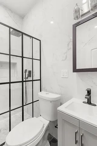 On the lower level is a fully finished space with a second full bathroom. The open floor-through room is flexible for use as an office/work from home space, a living area or additional sleeping area.
