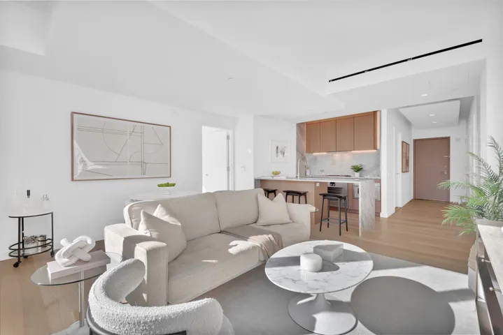Presenting residence 3A at 611 West 56th Street. This one-of-a-kind southeast-facing corner one-bedroom, one-and-a-half-bath residence spans an impressive 868 square feet, offering refined elegance, abundant natural light, and contemporary sophistication. The coveted A-line layout is bathed in sunlight through oversized corner windows, complemented by wide-plank white oak flooring and a serene neutral palette. A discreet powder room near the entryway adds a touch of privacy for guests while entertaining.