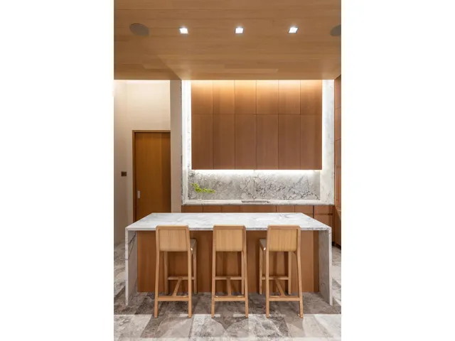 The open-concept chef’s kitchen is a showcase of craftsmanship and modern luxury, featuring top-of-the-line Gaggenau appliances-including a stainless steel refrigerator, freezer, gas range, speed oven, and dishwasher-set against custom Italian walnut cabinetry. Honed Grigio Nicola marble countertops and a matching slab backsplash add a striking yet understated finish.