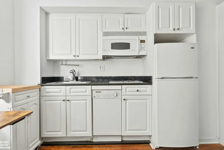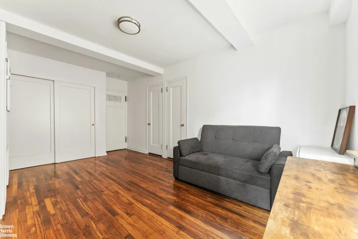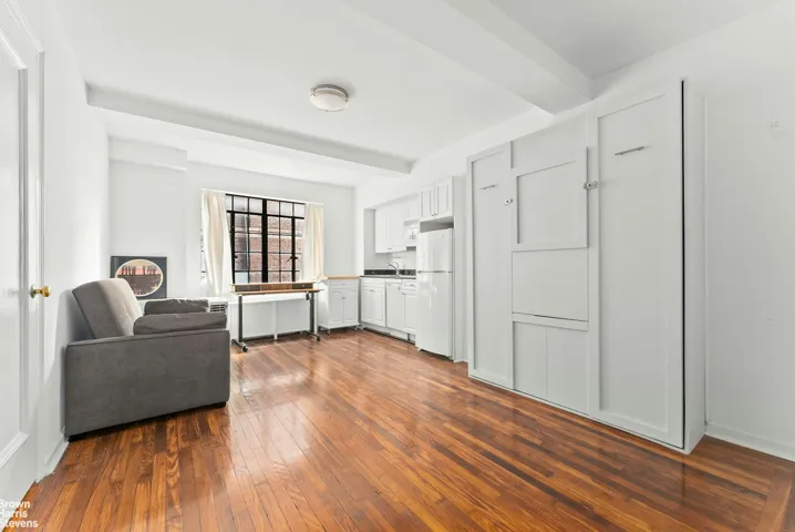 Featuring a space-saving Murphy bed with a retractable table, the apartment transforms seamlessly from a sleeping area to a comfortable dining or workspace. The Pullman kitchen is efficiently designed and perfect for everyday cooking, while two large closets provide ample storage-an exceptional find in NYC studios.