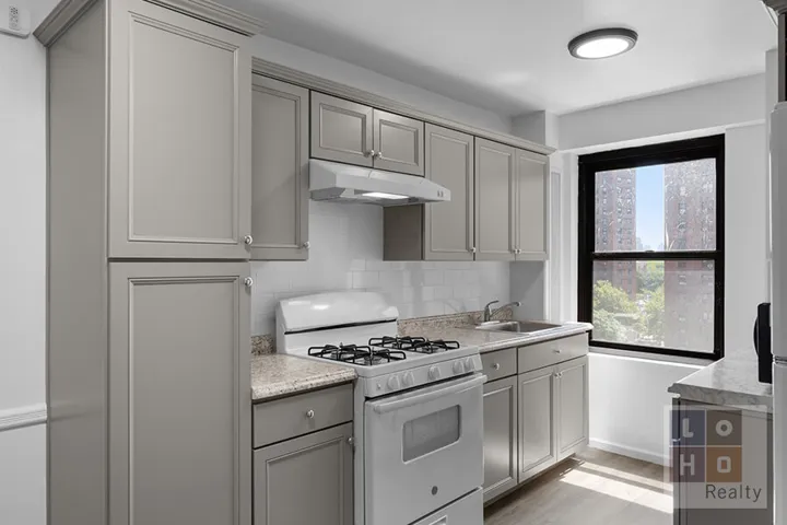 The windowed kitchen offers timeless gray cabinetry, a subway tile backsplash, and full-size appliances, combining classic style with modern function.