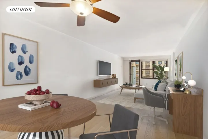 Welcome to Residence 9N at 345 East 81st Street — a sun-drenched, beautifully renovated one-bedroom, one-bathroom home with a rare, oversized private balcony offering sweeping south-facing skyline views. A gracious entry foyer opens into a spacious living and dining area, anchored by wide-plank white oak flooring and framed by floor-to-ceiling glass doors that lead to your full-width balcony — for morning coffee, evening cocktails, or simply soaking up the sun. The renovated galley kitchen features stainless-steel appliances, sleek wood cabinetry, and a chic glass tile backsplash.