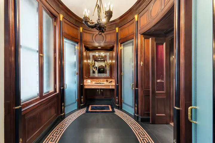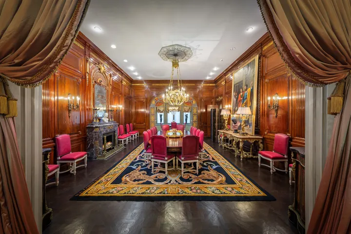 On the parlor floor, with ceilings reaching over 14 feet high, the elegant drawing room connects to the deep, wood paneled formal dining room with capacity to seat over 50 people on one side, and an opulent living room illuminated by four floor-to-ceiling windows on another. Off the dining room, there is also a solarium/morning room and a serving kitchen that includes a seating area, and ample storage.