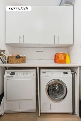 Additional luxurious highlights include 9″ high ceilings, wide plank hardwood floors, central air throughout, 8 generous closets including 2 walk-ins, and a dedicated large laundry closet with a Miele washer and dryer and lots of storage.