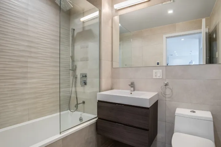 The king-size bedroom provides ample light and closet space, complemented by a modern bathroom with a deep soaking tub, contemporary tiling, and customizable heated floors.