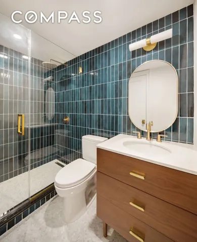 Upon entering the upper three-bedroom duplex, you are greeted by a welcoming foyer and an elegant full glass entry door. The expansive 36-foot parlor showcases an open and airy floor plan, enhanced by floor-to-ceiling windows that bathe the space in natural light. At the front of the home, the formal living area provides a superb setting for entertaining, while the centrally positioned dining area and elegantly crafted powder room enhance both convenience and style. The kitchen is a chef’s dream, complete with a central island, custom cabinetry, and sleek quartz countertops. It includes a full suite of top-of-the-line appliances: an integrated Bosch refrigerator and dishwasher, a Wolf six-burner stove, and a Sharp microwave drawer.