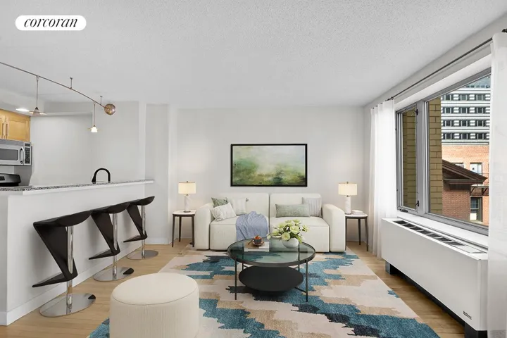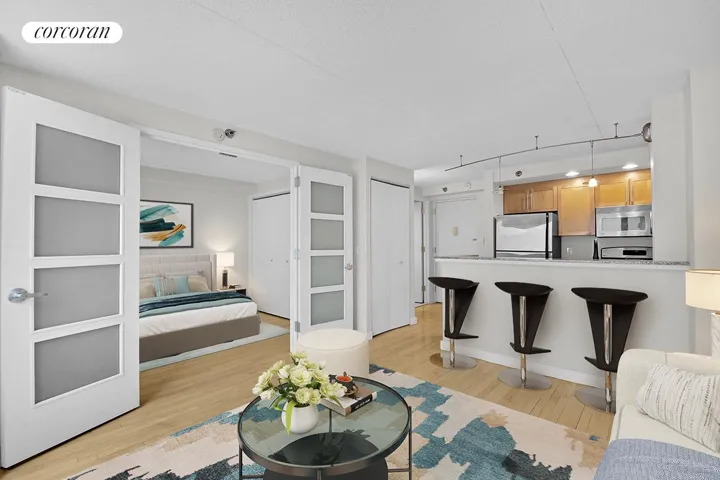 Welcome home to this serene, east-facing one-bedroom condo at Boulevard East, located at 53 Boerum Place in vibrant Boerum Hill, Brooklyn. The apartment features hardwood floors throughout and an inviting open kitchen with granite countertops, stainless steel appliances including dishwasher and microwave and a practical breakfast bar perfect for casual dining and entertaining.Glass-paneled French doors elegantly separate the spacious living area from the comfortable bedroom, which easily accommodates a queen-size bed and offers ample closet space. The modern bathroom is thoughtfully designed with sleek finishes, generous storage, and a large mirrored vanity.Boulevard East is a full-service condominium offering a 24-hour doorman, fitness center, resident lounge, on-site laundry, and a beautifully landscaped courtyard. The building is pet-friendly.Ideally situated at 53 Boerum Place, residents enjoy unparalleled access to Brooklyn’s finest dining, green spaces, and entertainment. Dine at top-rated restaurants such as French Louie or Rucola, or enjoy cocktails at the renowned Clover Club. Nearby Brooklyn Bridge Park and the Brooklyn Heights Promenade offer stunning views and recreation. Conveniently close to Barclays Center for sports and entertainment, Trader Joe’s, Whole Foods, Brooklyn Fare, and shopping at Barnes & Noble, Macy’s, and the Apple Store. Easy access to multiple subway lines (N/R/Q, 2/3, 4/5, F/G, A/C) makes commuting effortless.
