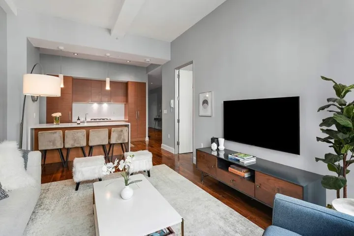 As you enter the apartment, you’re greeted by a grand gallery-style foyer—with soaring ceilings nearly 11 feet high and oversized windows in both the living room and bedroom, natural light floods the entire home, highlighting the luxurious walnut hardwood floors that run throughout. To the left of the foyer, an oversized coat closet offers exceptional storage and the gallery-style hallway provides the perfect setting to showcase your art collection.