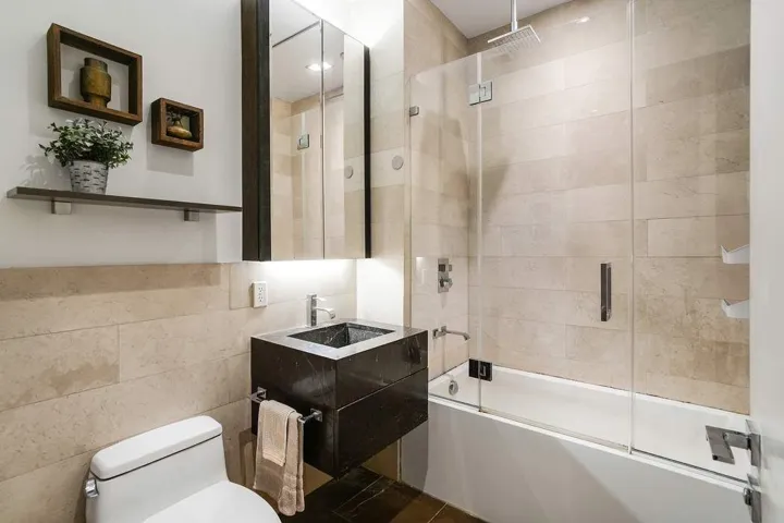 The elegant bathroom, conveniently located off the gallery hall, features refined tilework, a full-size soaking tub with shower, and plenty of built-in storage. A stacked washer/dryer discretely integrated in the kitchen adds further convenience to city living.