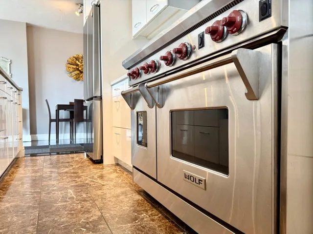 • Wolf 48″ gas range with four burners, charbroiler, and griddle