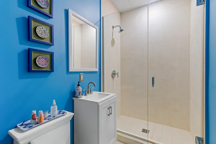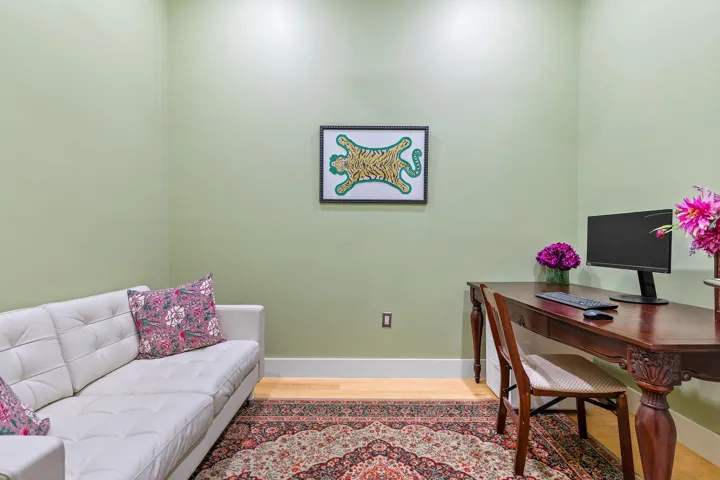 The flexible home office can easily serve as a guest room, den, study, nursery, creative space or podcast studio and is adjacent to the renovated full guest bathroom.