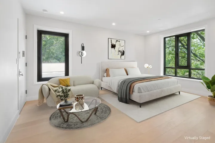 Welcome to Residence 401 – This two-level home features a versatile layout. The main level comprises a comfortable 2-bed, 1-bath unit, enhanced by two private balconies. Upstairs, the second level is a private, studio-like suite with its own bedroom, bathroom, and a separate entrance ensures total privacy for guests or family. A pantry can be added for extra convenience. This exceptional residence blends indoor elegance with unparalleled outdoor living space, offering the ultimate urban oasis for hosting gatherings or enjoying private moments above the city. Step inside your new home through a state-of-the-art smart keyless entry system and be greeted by soaring 10-foot ceilings and oversized double-glazed windows, flooding each residence with abundant natural light while providing superior noise cancellation. The interiors are adorned with wide-plank oak flooring, adding warmth and elegance to the open, airy layout. The custom Tafisa cabinetry sets the stage for a sleek, modern kitchen, featuring white quartz countertops, a waterfall island, and a continuous slab backsplash. High-end appliances include a Fisher & Paykel premium refrigerator with water dispenser, a 30-inch GE Slide-In Smart gas range with 5 sealed burners, a Faber venting hood, and a fully integrated Café built-in dishwasher. The spacious bathrooms are designed for relaxation, featuring light gray porcelain tile flooring and walls, fully recessed medicine cabinets with LED lighting and defoggers, and elegant Kohler fixtures. Each home also includes a convenient in-unit washer-dryer in a dedicated laundry closet, along with energy-efficient Mitsubishi heating and cooling systems. Closets were custom-designed which optimizes storage – every inch crafted for effortless organization and everyday convenience.