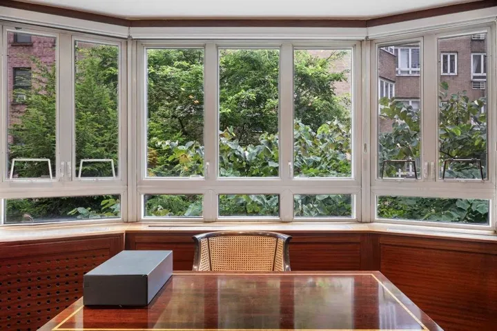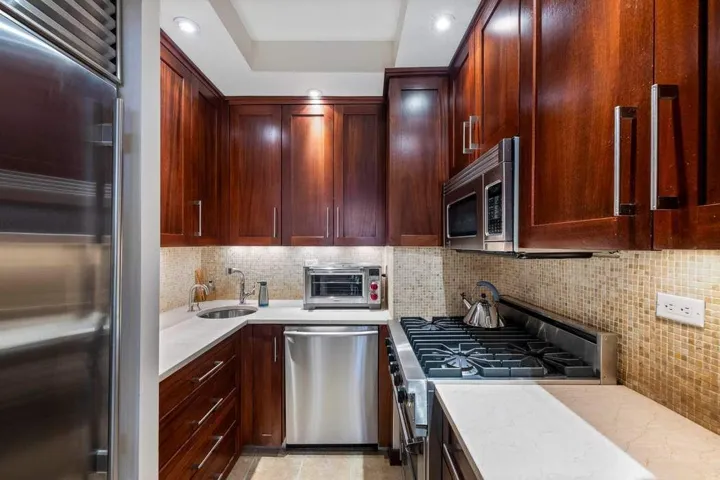 Upon entering, you are immediately greeted with peace and quiet. The home welcomes you with a convenient entry foyer which leads in to your graciously proportioned living and dining room. Adorned with charming treetop views, sink in to this utterly private and tranquil space for the ultimate retreat from the busy city life. Lutron lighting, through wall air conditioning, and large, double paned bay windows elevate the room for maximum comfort. Off of the living room is your dining area, surrounded by custom built-ins and conveniently connected right to the kitchen. Equipped for standard nights in or entertaining guests, the combination of top-of-the-line Wolf Appliances, custom mosaic tile backsplash and countertops, and a properly allocated dining space makes for a pleasurable experience no matter the occasion.