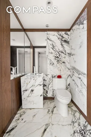 The corner primary bedroom features a double-exposure with both Northern and Eastern city views. The spa-like en-suite bathroom features elegant marble floors, walls, and countertops and is equipped with a luxurious steam shower, deep soaking tub and radiant floor heating.