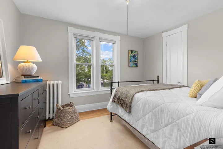 Inside, stunning prewar details abound, including soaring ceilings, large windows, and original architectural character. The first floor boasts an impressive living room, a formal dining room and an adjacent kitchen that flows seamlessly for everyday living, and entertainment. Upstairs, you’ll find two comfortable bedrooms and a well-appointed full bathroom.