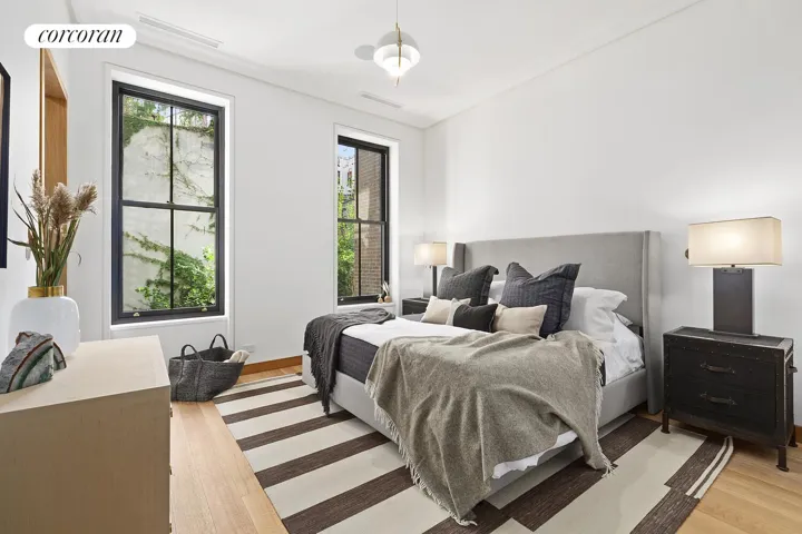 This is a Smart House by Lutron Homework Systems with automatic Lutron blinds and keyless entry. The second entrance has a reception area that is great for packages. There is a magnetic self-closing door that is operated by an app. The house is fully integrated with Daikin Air HVAC, all zoned with humidifiers. Details include 7″ wide White Russian Oak floors, custom solid White Russian Oak doors from Cider Press Woodworks, Vali Vali hardware for doors, Lutron lighting, and Mel Jac switches and outlets. All of this in the center of the West Village. Please contact us for a private showing.