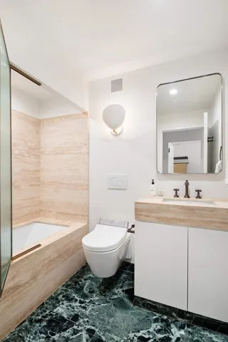 Two secondary bedrooms are tucked quietly down the hall, each opening onto a New Orleans-style balcony overlooking lush brownstone gardens. Up the sensuous stairway, the primary bedroom along with its en-suite bath, walk-through wardrobe and French doors with additional balcony makes for an ideal separation of space. A washer/dryer and virtual doorman complete this home.