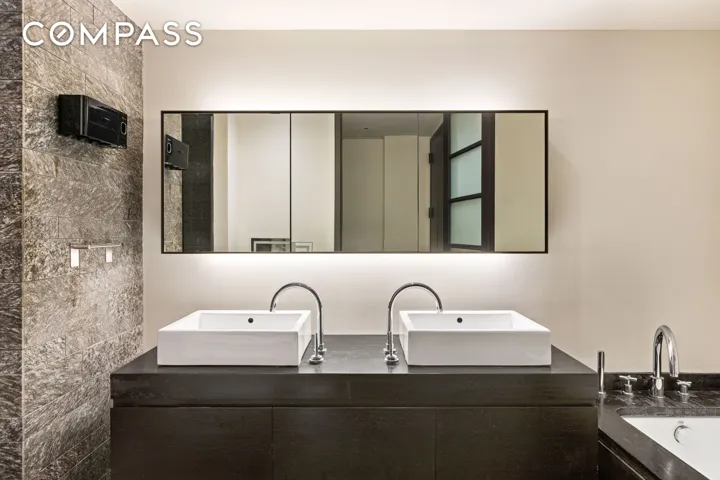 The chef’s galley kitchen impresses with concealed appliances behind rich walnut cabinetry, including a Sub-Zero refrigerator with double freezer drawers, Miele gas range, Fisher & Paykel dishwasher, and in-unit washer/dryer. The spa-inspired bathroom is wrapped in imported gray stone with double vanity, deep soaking tub, and a rain-head glass-enclosed shower.