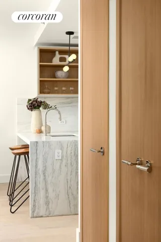 Flooded with sunlight through oversized windows, each residence boasts 7-inch-wide plank white oak flooring, solid core doors, and luxurious polished nickel hardware throughout. Chef’s kitchens are finished with custom cabinetry in soft neutral tones, elegant marble countertops and backsplashes, designer lighting, and best-in-class Bosch appliances, including induction cooktops.