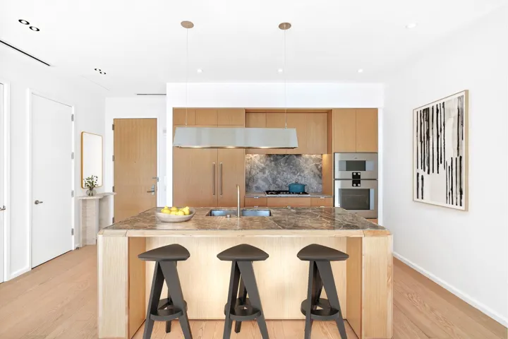 The foyer leads into a spacious light-filled open plan kitchen and living/dining area that is crafted with an immaculate attention to detail. The Workstead-designed kitchen features raked maple cabinetry paired with satin nickel hardware, Gaggenau appliances and additional pantry. The kitchen features a statement island with inlaid Fior di Bosco stone slab and chamfered edges