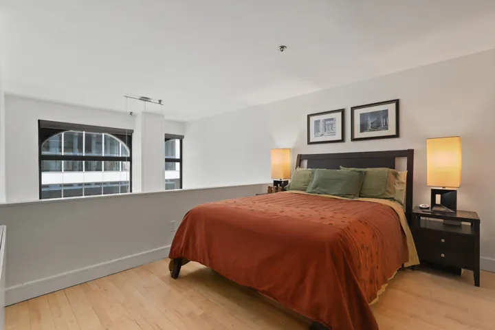 The mezzanine has a spacious, windowed, sleeping loft, home office and a large walk-in closet. Subject to Co-op Board approval, there is potential to add a second bathroom in the rear of this closet.