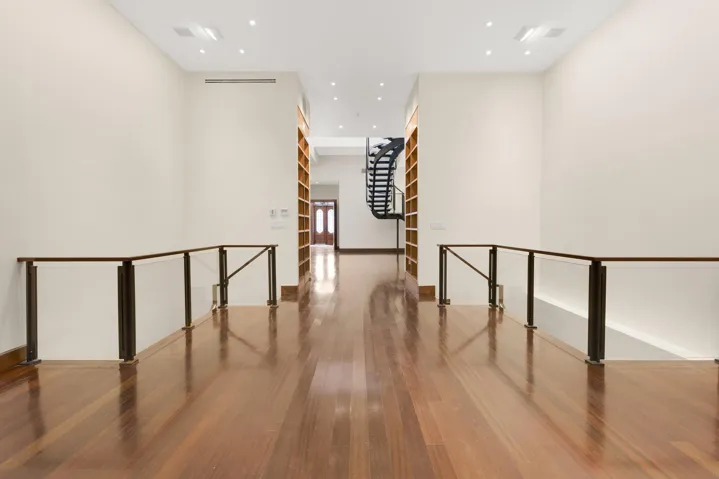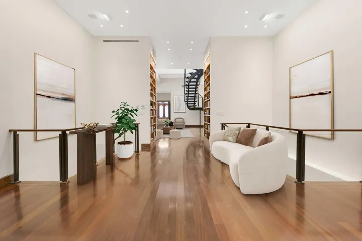 Just below, a dining area and kitchen offer generous proportions for entertaining. A terrace on this level provides a tranquil outdoor retreat in the heart of the city.
