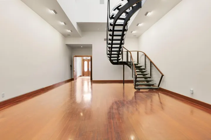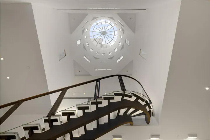 Upon entry, a few steps lead to a grand foyer, followed by a luminous and expansive main living room. With soaring ceilings and remarkable volume, the space is crowned by a dramatic central light dome that floods every floor with natural light.