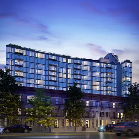 Designed to maximize light, comfort, and flow, this studio welcomes you with soaring ceilings and floor-to-ceiling windows that frame a backdrop of Bed-Stuy’s storied streetscape. A thoughtfully placed sleeping alcove offers a private nook for rest, while the open living/dining space invites both relaxation and entertaining. The kitchen blends modern convenience with timeless charm, featuring shaker cabinetry, solid surface countertops, stainless steel appliances, and subtle lighting accents that create a warm glow in the evenings. Wide-plank floors run throughout, tying the space together with natural texture.