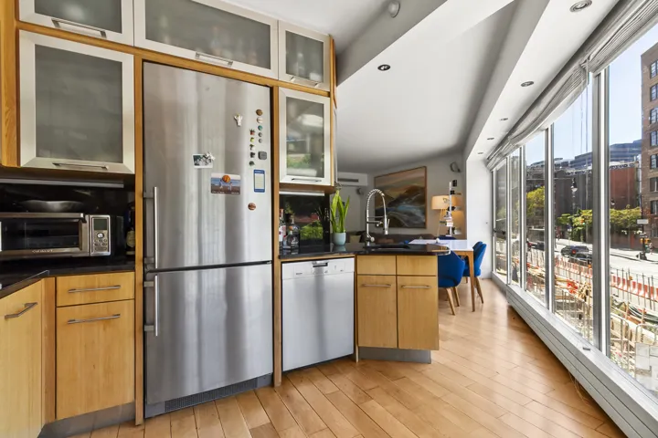 The key-locked elevator opens directly into an expansive living room, where a full wall of oversized windows frames classic Village views. The open, windowed chef’s kitchen is outfitted with granite counters, custom wood cabinetry, and Miele and Liebherr appliances, including a built-in coffee/cappuccino maker, vented gas range, and garbage disposal.