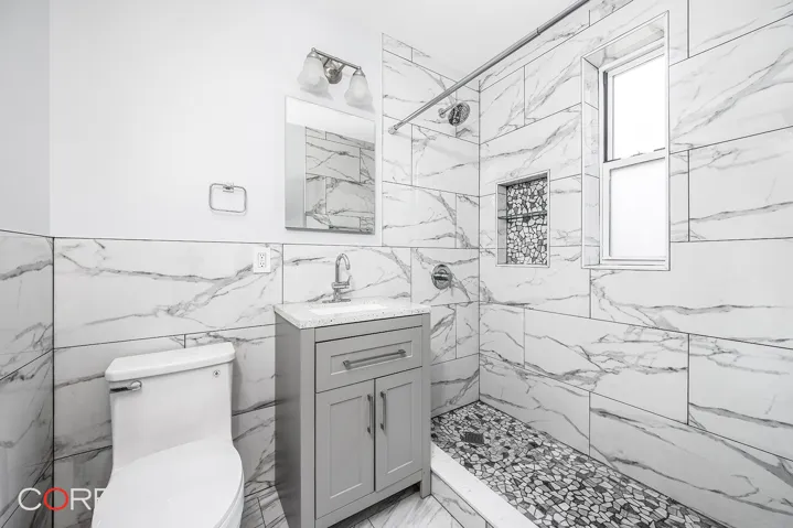 The kitchen offers stone counters, a custom ceramic tile backsplash, quality cabinets, and is equipped with a full line of stainless steel appliances. The generous living area enjoys the view of the private garden and amazing natural light. It is cleverly reconfigured to allow for a double exposure and easy access to the fully renovated bath.