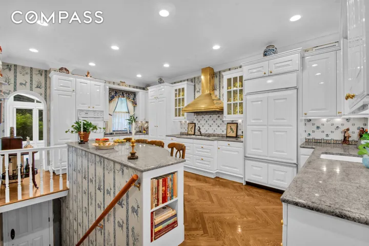A Rare Grymes Hill Masterpiece nestled in the prestigious Grymes Hill section of Staten Island, this timeless residence—home to only two discerning owners—offers a rare opportunity to own a piece of architectural history. Built in 1936 as a faithful replica of the Sloane’s House of the Years featured in House & Garden (October 1935), the home is a testament to design, craftsmanship, and enduring style. Step through the solid wood entry door into a dramatic double-height foyer, where a gracefully curved staircase of brass and iron rises above striking black-and-white marble inlaid floors. The handcrafted library, complete with a gas fireplace, original millwork, and wood paneling, reflects an era of refinement. Generously scaled rooms are filled with natural light through large windows, while multiple fireplaces and rich hardwood floors add warmth and elegance throughout. The formal dining room easily accommodates grand dinner parties, while the living room with French doors gently blends a bit of outdoor nature. A family room/sunroom as an extension adds additional space, and an atrium that provides inviting spaces for entertaining or quiet enjoyment. The updated kitchen combines timeless details with brass accents, and a breakfast bar with a dining area, while a powder room with Sherle Wagner fixtures adds a touch of luxury. Upstairs, four well-proportioned bedrooms and two full art deco-inspired bathrooms occupy the private level, complemented by attic storage. The lower level features a full basement with a large recreational and entertainment area, a gas fireplace, a fitness area, a second kitchen, cedar closets, and a full bath—ideal for extended gatherings or multi-generational living. and access to the yard. Outdoors, mature plantings frame a saltwater in-ground pool with fountains and bluestone surround, offering a private oasis. A long driveway, classic brick exterior, and slate roof complete the picture of this stately home.