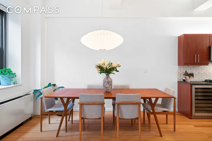 The expansive open living area is drenched in delightful Western light from two large windows, offering a perfect setting to host a dinner party or enjoy a quiet evening. Your culinary dreams come to life in the gourmet open kitchen, decked out with Pietra Cardoza limestone countertops, an art deco marble backsplash, and top-tier stainless-steel appliances including a Bosch dishwasher and wine cooler. Storage and workspace are abundant, making this kitchen both stylish and functional.
