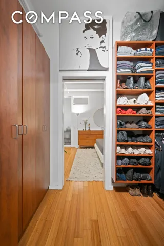 Retreat to the king-sized master bedroom, a true haven of tranquility, featuring a custom walk-in California Closet. The luxurious ensuite bath is your own private spa, with a soaking bathtub and a custom marble dual-sink vanity. The second bedroom, adaptable as a home office or guest room, cozily fits a queen bed and includes a stylish floor-to-ceiling armoire. Alternative floor plan allows for a powder or second bathroom. Practicality meets style with an in-unit Asko washer/dryer and additional storage crafted by California Closets.