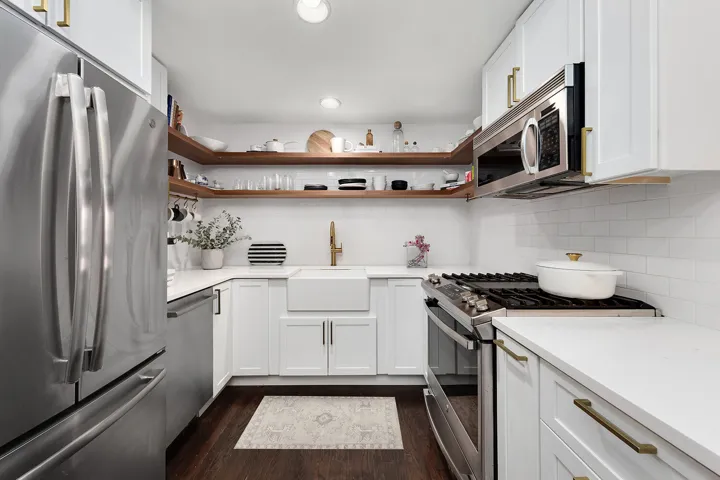 The recently renovated kitchen features a spacious wraparound quartz countertop, a deep farmhouse kitchen sink, open shelving, stainless steel appliances, plus numerous storage drawers with gold hardware.