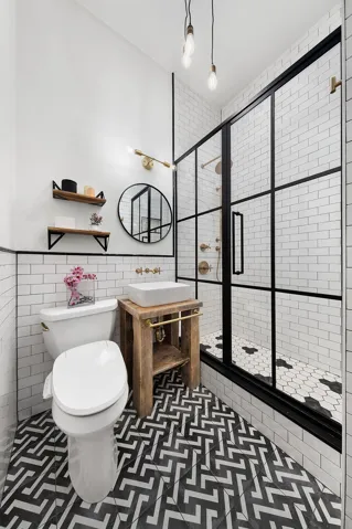 The recently renovated bathroom features 12 ft ceilings, attractive designed patterned floor tile, a dramatic glass and steel shower door, gold hardware in the shower and sink, a large rain shower head, and a toilet equipped with a bidet.