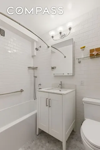 Elegant gut-renovated bath boasts Madeli vanity with white Carrara quartz top, Oceana Bath Pure white tub, Sofia medicine cabinet, Crosswater Heir one-piece single flush toilet, Crosswater faucets and shower controls, elegant lighting fixture, double outlet, white subway wall tiles to the ceiling and Carrara marble white/light gray hexagonal floor tiles.