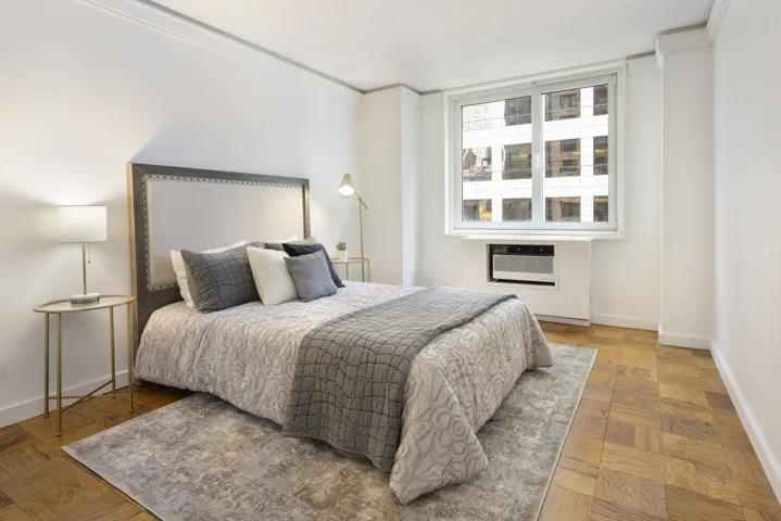 Spacious bright North-facing one-bedroom, one-bathroom apartment in a luxury full-service building located in Midtown West. Features a huge bedroom, an open kitchen with a breakfast bar, sparkling white cabinetry, sleek white tiled bath and generous closet space